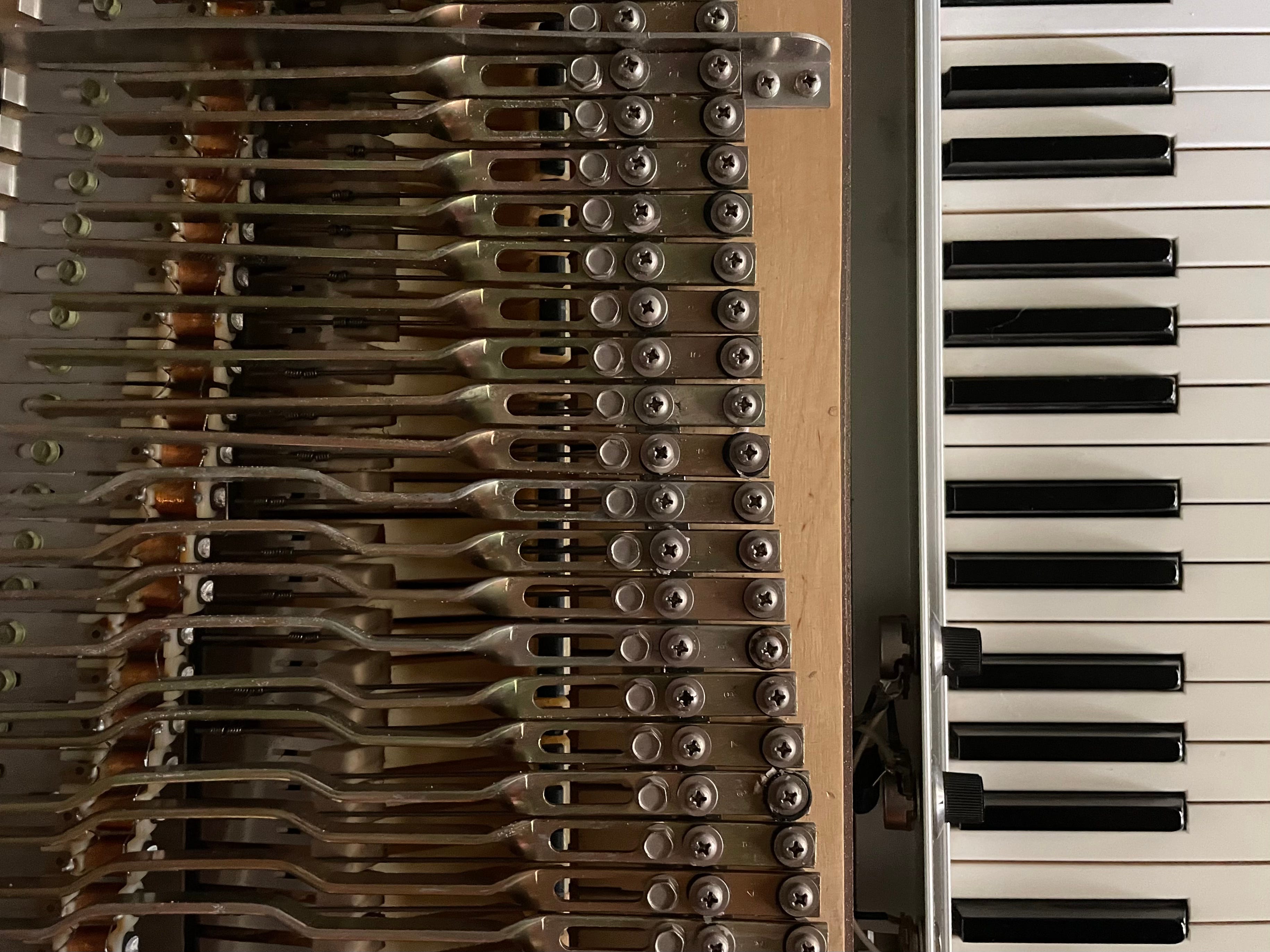 My uncle, himself a talented musician, retired and let go of most equipment in his home studio. I was the lucky recipient of his pristine Mark 1 Rhodes (all 88 keys and 150 pounds of it), and I’m still pinching myself to this day. It’s a 1977 model, which places it firmly in the Mark 1 Rhodes era (roughly 1975-1979). By the way…There’s a fantastic history of the evolution of each of the model years on the Rhodes “Super Site” with all kinds of extra detail (link here). These pianos were still being manufactured by Fender in their Fullerton, CA factory, but the company made the decision to drop the Fender name from the instrument in an effort to let the Rhodes brand name stand on its own and expand sales to more music stores beyond just Fender dealers.