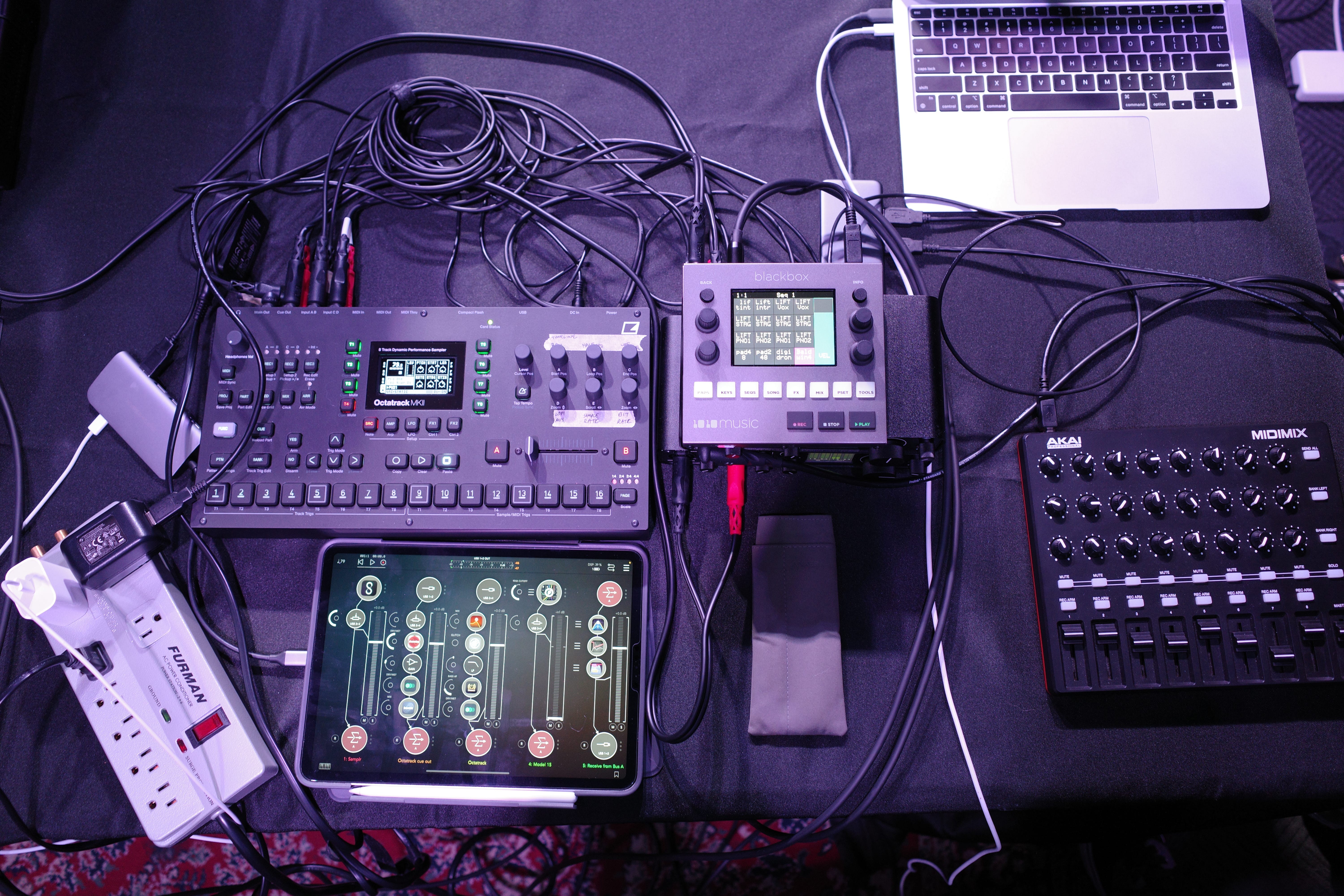 I love playing live shows with the blackbox because of its tiny size and the ability to play back samples of any length, polyphonically, for rich multi-octave layers. I do this quite often with Hotel Neon to play back critical Kontakt sounds that were used on the albums.