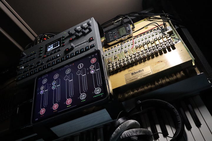 I recorded this video because I’m in the process of following up on that effort with a new take on this method of using the Rhodes as my main sound source. The jam I posted was basically a test case for how I’d like to set up my equipment to record it again.